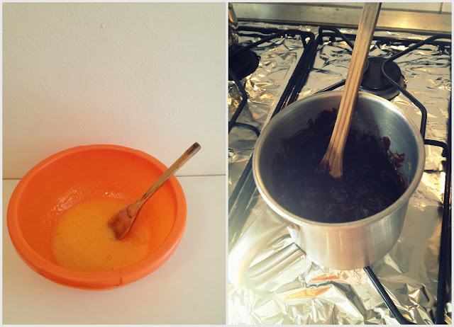 Derreter o chocolate com a manteiga e acrescentar as folhas de gelatina.
